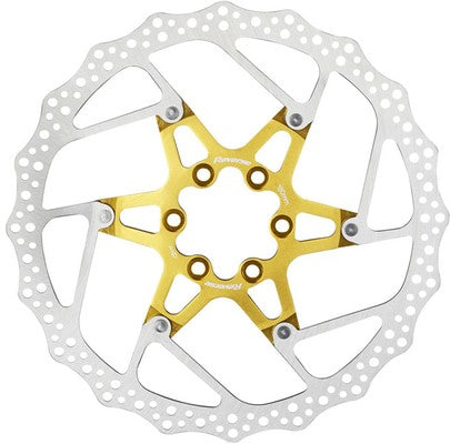 " Specials " Brake Disc Rotor Bicycle Reverse Components Aluminium / Steel 180mm 6 Bolt Gold Colour match your ride! Our 2 piece alloy / steel disc rotor gives you a ton of options for your custom build. Our high performance steel braking surface provides you the optimum brake power and the alloy spider keeps the weight low. Available for all brake models.