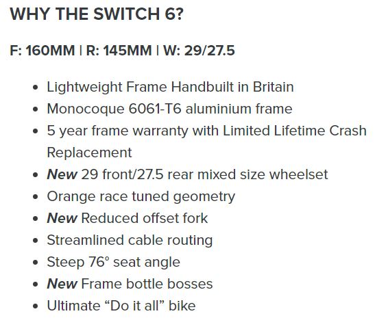 Orange Bikes Switch 6 RS Large Enduro Mullet Matt Charcoal Grey {pic is Blue bike is Grey} rrp $9495 The Switch 6 is our first mixed wheel size bike, 29er wheel upfront with 160mm of travel and 27.5 wheel out back with 145mm. This model comes with all the frame updates that we’ve integrated into the latest line-up; Metric shock, 76° seat angle, 64° head angle, with a generous 485mm reach on a size large and a reduced offset fork, this bike is clearly set-up with the agressive rider in mind. Aimed at racers and fast trail riders this genre of bike has become the hottest ticket around, whether you call them a 'Mullet' or 'MX', the mixed size wheelset makes a massive amount of sense, but only if you apply the right geometry. The Switch 6 has it's geometry tuned to put all the key frame elements in the right place, therefore the ride by design is what you would expect from an Orange.