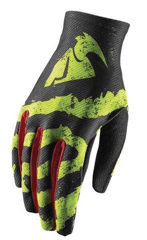 Simplicity at its finest. The Thor Void gloves are the lightest, most minimalistic glove in the entire Thor line and were designed for the rider that appreciates maximum feedback from the motorcycle. With a 4-way stretch top panel and single layer palm, the Void glove provides premium flexibility and articulation. The strapless design leaves your wrists unrestricted to improve blood flow and in turn, fight arm pump. Features: * Fitted stretch backhand panel provides lightweight comfort * Perforated palm keeps hands cool * 4-way stretch finger gussets enhance mobility * Screen printed palm graphics * Wrapped thumb and gripping points for added durability * 95% Polyester, 5% Nylon