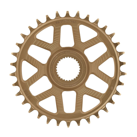 e*thirteen Helix Race e*spec Ring 34T Bosch Gen4 Direct Mount 53mm Chainline Shimano/SRAM 11/12 speed Chain Compatible BronzeDesigned for Bosch Gen 4 e-bikes, this 1pc direct mount chainring is forged from 7075 AL for stiffness, strength and the longest wear life. The extensive CNC machining and M3 tooth profile delivers an ultra lightweight upgrade chainring that offers the best cross compatible Shimano/SRAM chain retention and eye-catching technical aesthetics. A custom outer dust cover enhances the integrated style and helps to prevent